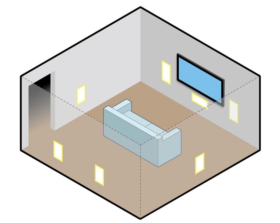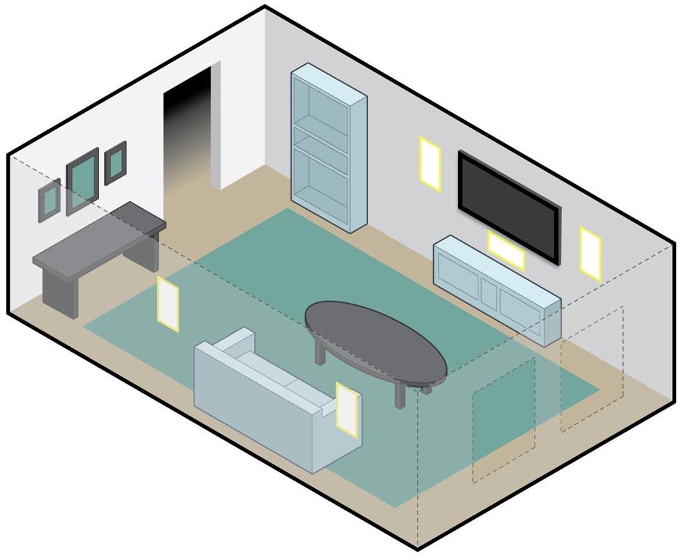 Планируете домашний кинотеатр в гостиной или комнате студии? Или это будет отдельная комната для домашнего кинотеатра, которая используется только для просмотра фильмов или спортивных трансляций? Идеальное размещение в стене в обоих случаях примерно одинаковое. Высота левого и правого каналов может варьироваться в зависимости от особенностей размещения мебели и ТВ в вашей комнате.