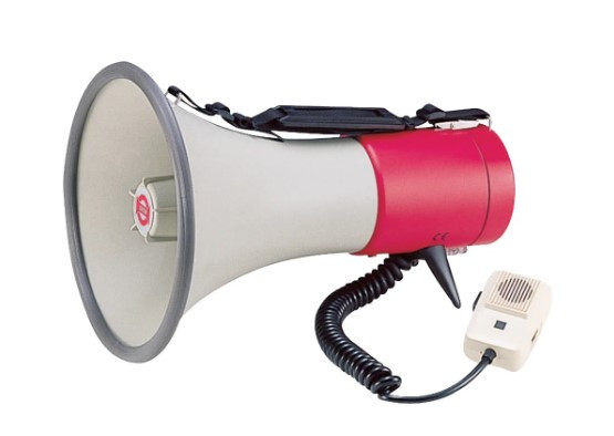 Рупорный громкоговоритель (мегафон) с выносным микрофоном и сиреной Материал - пластик Регулятор громкости Мощность - максимальная 25 Вт Диапазон - 0,5 - 0,7 км в зависимости от условий эксплуатации Напряжение питания - 12 в, 8 батарей тип "С" (приобретаются отдельно) Сопротивление 8 Ом. Размеры: диаметр - 230 мм., длина - 340 мм. Вес - 1,65 кг ( без батарей) Батарейки в комплект не входят